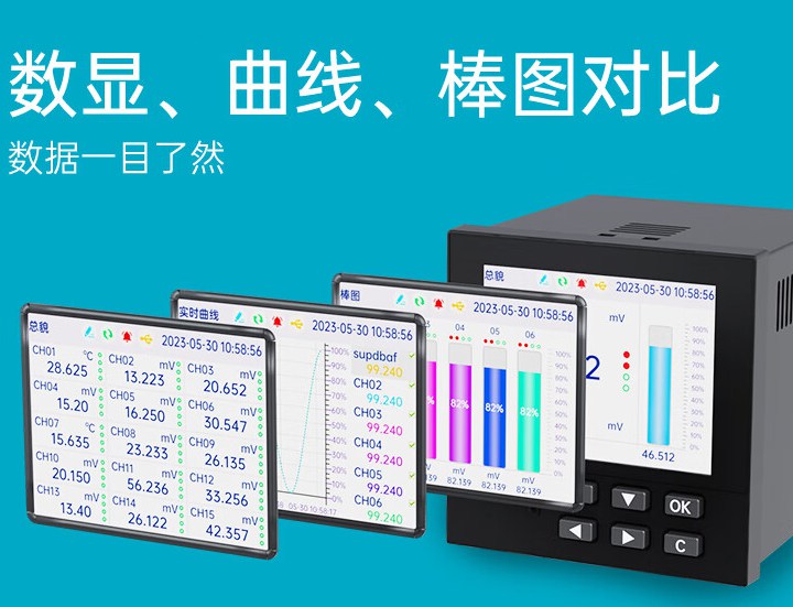 米科无纸记录仪以其丰富的图表展示功能,为用户提供了直观的数据对比体验。用户可根据需求选择柱状图或曲线图,轻松对比不同时间段或不同参数的数据变化。柱状图直观展示数据大小,曲线图则能清晰呈现数据趋势。这种对比方式不仅简化了数据分析过程,也提高了数据解读的准确性和效率。